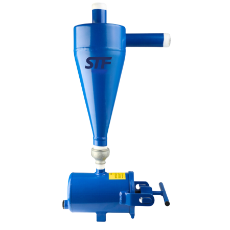 A água entra no hidrociclone através da entrada tangencial, criando um fluxo em espiral ao longo das paredes do filtro. A força centrífuga separa os detritos e as partículas de areia, empurrando-os contra as paredes do separador de areia.