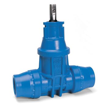 Válvula de ramal POM com tampa AVK e embocaduras auto-blocantes para tubos de PE. Para água potável e líquidos neutros.