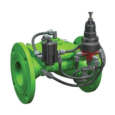 A Válvula Redutora de Pressão Normalmente Fechada com Controlo Hidráulico BERMAD IR-420-54 é uma válvula de controlo operada hidraulicamente e acionada por diafragma que reduz níveis de pressão superiores a montante em níveis de pressão inferiores e constantes a jusante, independentemente das variações de consumo na rede, e abre totalmente mediante uma queda na pressão da conduta. É uma válvula normalmente fechada, que abre em resposta a um comando remoto de aumento de pressão e se fecha na ausência desse comando.